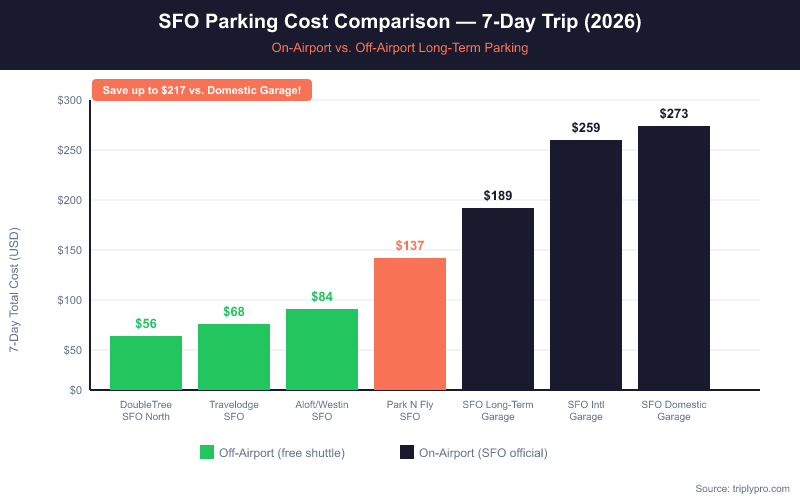 The SFO Long-Term Garage charges a maximum of $27/day (verified April 2026), per the official SFO parking rates page. Off-airport lots start as low as $8/day after pre-booking discounts. For a one-week trip, that difference adds up to more than $130. Booking in advance through a comparison platform is the most reliable way to lock in those savings before rates climb.