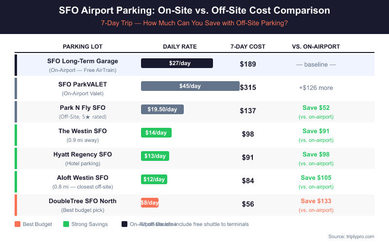 - Off-site lots start at $8/day — up to 70% less than SFO's $27/day Long-Term Garage rate.