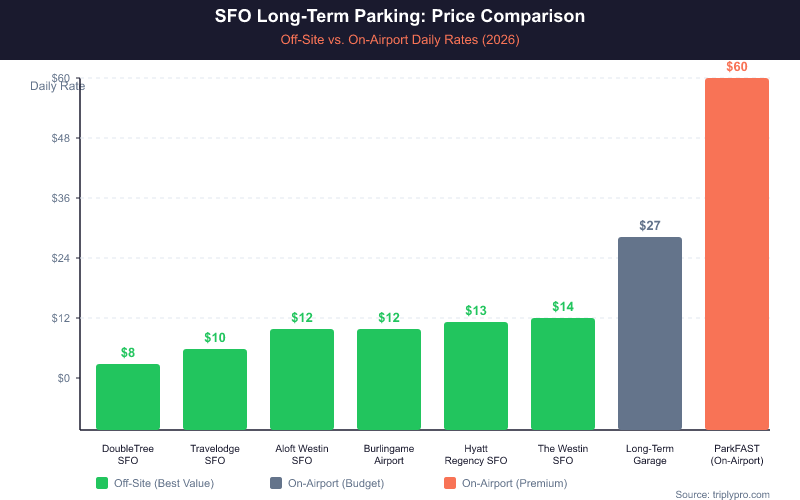 Yes — off-airport parking near SFO is significantly cheaper than any on-site option. The cheapest on-airport rate is the Long-Term Garage at $27/day. The cheapest off-site lot verified for 2026 is the DoubleTree SFO North Bayfront at $8/day — a savings of 70%. For a 5-day trip, that's $95 vs. $135, a difference of $40. For a 10-day trip, you'd save $190.