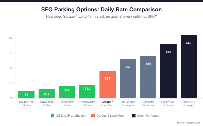 For a 7-day trip, Garage 1 costs $189 total. That's still significantly more than the cheapest off-airport option — DoubleTree SFO North Bayfront at $8/day comes to just $56 for the same week. But Garage 1 keeps you on airport property with no shuttle dependency. For a full breakdown of weekly costs, see our guide to SFO long-term parking weekly rates.