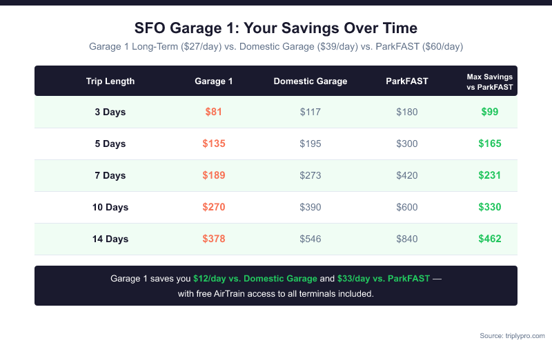 Garage 1 is the most affordable on-airport option at SFO. The trade-off is an AirTrain ride to your terminal instead of a direct walkway connection. The Domestic Garage and International Garage both connect to terminals on foot, but cost $10-12 more per day. For a week-long trip, that gap adds up to $70-84.