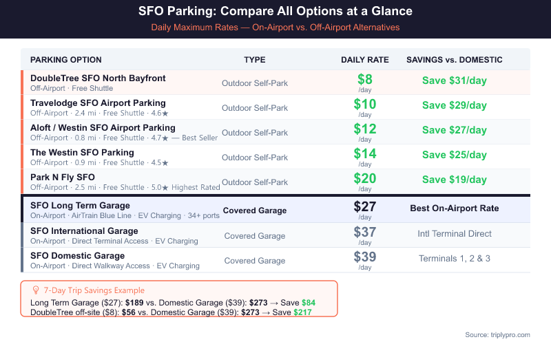 Off-airport parking near SFO starts at just $8/day — a potential savings of up to 70% versus the Long Term Garage's $27/day rate. Every off-site lot in the verified database below includes a free shuttle to SFO terminals. All have free cancellation policies (verified April 2026, based on current Triply rates).