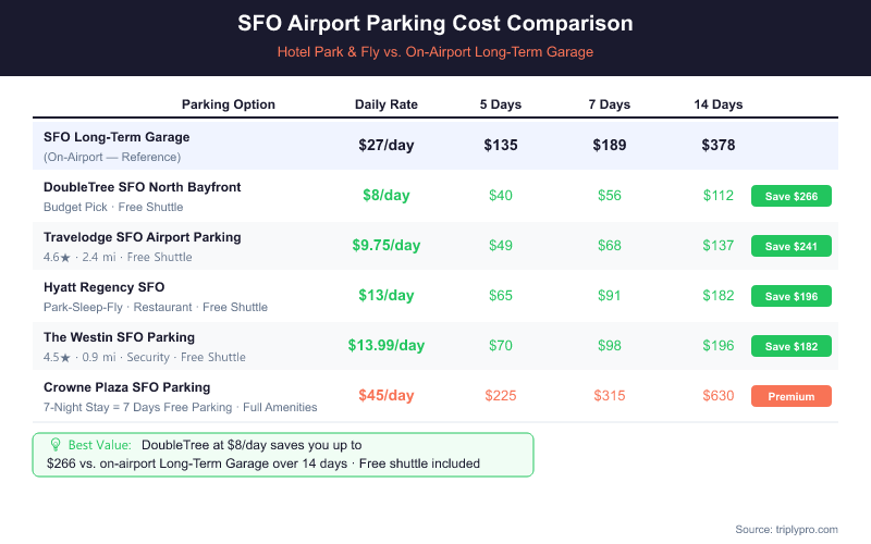 The cost difference between hotel park-and-fly and on-airport long-term parking at SFO is significant. The official SFO Long-Term Garage charges $27/day (per SFO's official parking rates, verified April 2026). Hotel lots near SFO start at just $8/day — a savings of up to 70% on a per-day basis.
