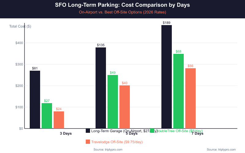 The SFO Long-Term Garage costs $27/day as of 2026, per the San Francisco Airport Commission's published rates. Off-site alternatives run $8 to $19.50/day for comparable self-park options with free shuttle access. The gap adds up fast on longer trips.