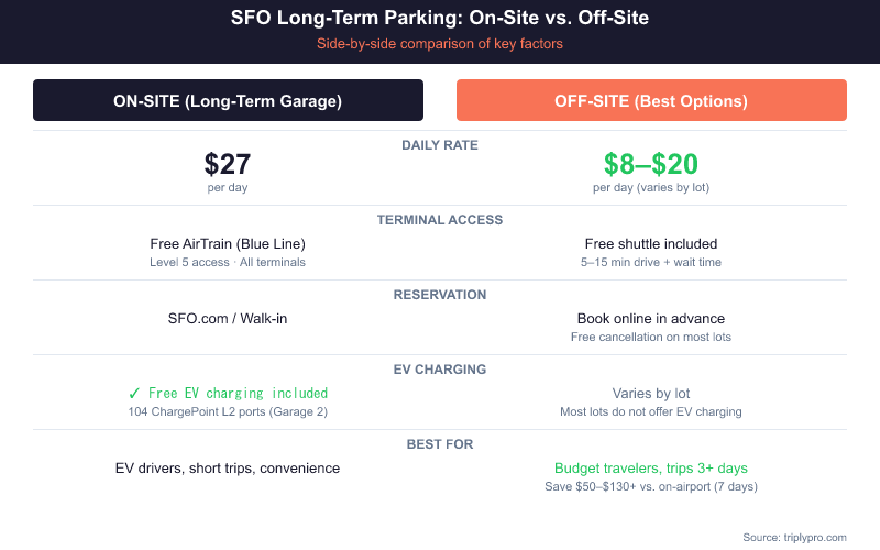 - Cheapest on-airport option: SFO Long-Term Garage at $27/day, connected to all terminals via free AirTrain Blue Line.