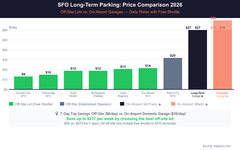 Off-site lots drop prices even further. Based on current Triply rates, the DoubleTree SFO North Bayfront starts at just $8/day — that's a 70% savings versus the Domestic Garage. Several hotel lots fall in the $12–$14/day range, offering a balance of price and amenities. The table below shows every verified option side by side.