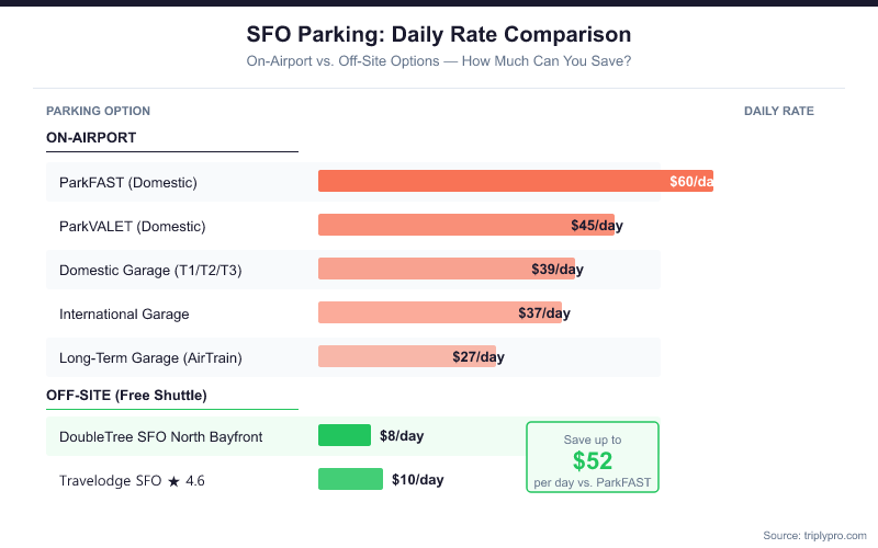 - Off-site savings: Off-airport lots start at $8/day — up to 70% cheaper than SFO's Domestic Garage at $39/day.
