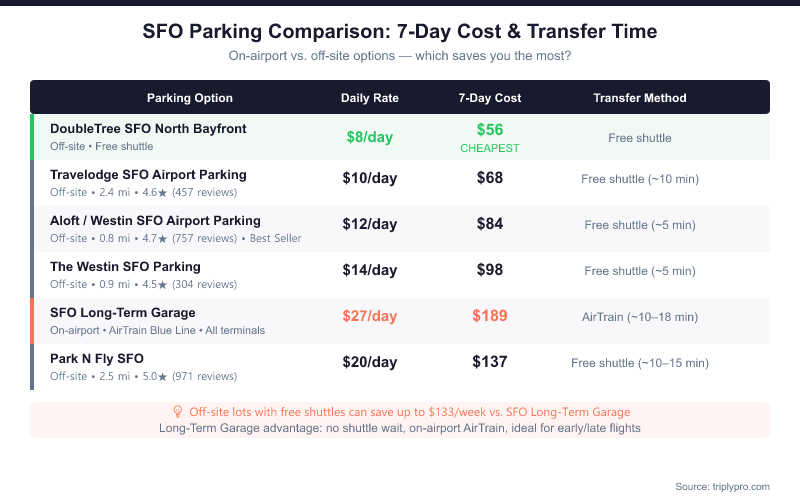 The DoubleTree SFO North Bayfront at $8/day saves you $133 over 7 days versus on-airport Long-Term Parking. That's a real saving. The trade-off is that shuttle schedules vary — you can't just walk out and board like you can with the AirTrain. For off-site lot details and more options, see our full guide to San Francisco off-airport parking.