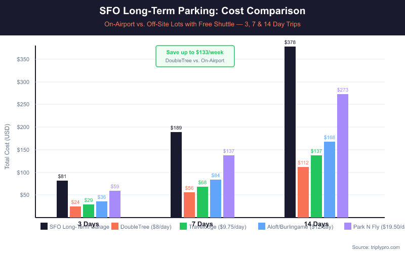 A 7-day trip at the cheapest off-site lot (DoubleTree SFO North Bayfront at $56 total) saves you $133 compared to the official Long-Term Garage ($189). For a 14-day international trip, that gap grows to $266 in savings. For a full weekly rate breakdown, see our SFO long-term parking weekly rate guide.