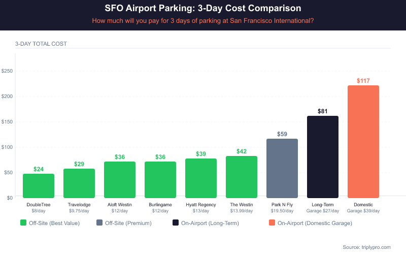 SFO parking for 3 days is a specific cost scenario where your total bill ranges from $24 (offsite, cheapest lot) to $180 (ParkFAST, onsite) depending on which lot you choose at San Francisco International Airport. The SFO Long-Term Garage costs $81 total for 3 days ($27/day), making it the most affordable onsite option. Offsite lots near SFO start at just $8/day, dropping your 3-day total to as low as $24 — a saving of up to 70% versus the Domestic Garage ($117 for 3 days).