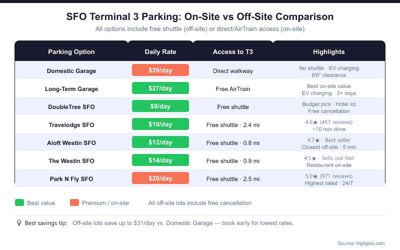 Off-site parking is the best value for most Terminal 3 travelers. Every off-site lot listed here includes a free shuttle to SFO terminals and offers free cancellation, based on current Triply listings. Shuttles typically drop off at the departures curb closest to your terminal.