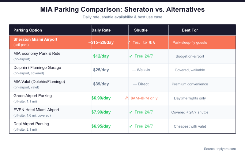 | Sheraton Miami Airport (self-park) | ~$15-20/day | Yes, to MIA | Hotel guests, park-sleep-fly |