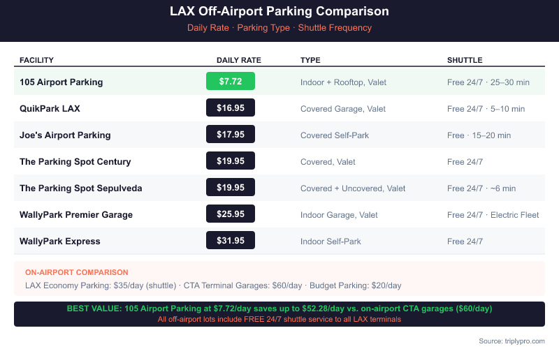 Before your trip, compare LAX off-site parking rates starting at $7.72/day on Triply — including UVP and every other verified lot near the airport.