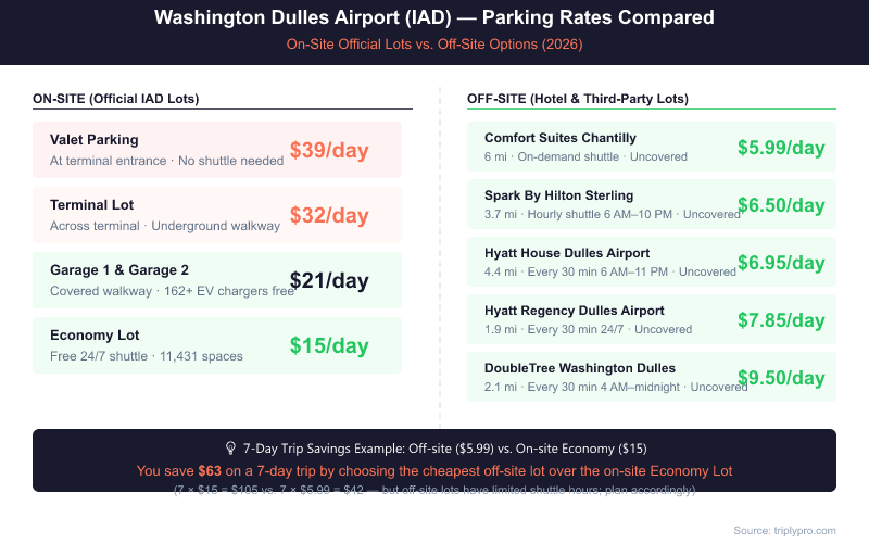 Off-site hotel parking near IAD costs between $5.75 and $9.95 per day — significantly less than even the Economy Lot. Every verified lot below includes a free shuttle to the airport. Rates are based on current Triply listings (verified April 2026).