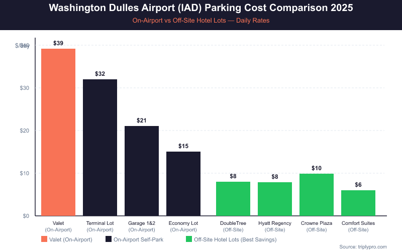 Pro tip: The Hyatt Regency Dulles lot via onestopparking.com at $5.75/day is currently the lowest verified daily rate near IAD. That's $15.25/day cheaper than Garage 1 or 2 — nearly $107 in savings on a 7-day trip.