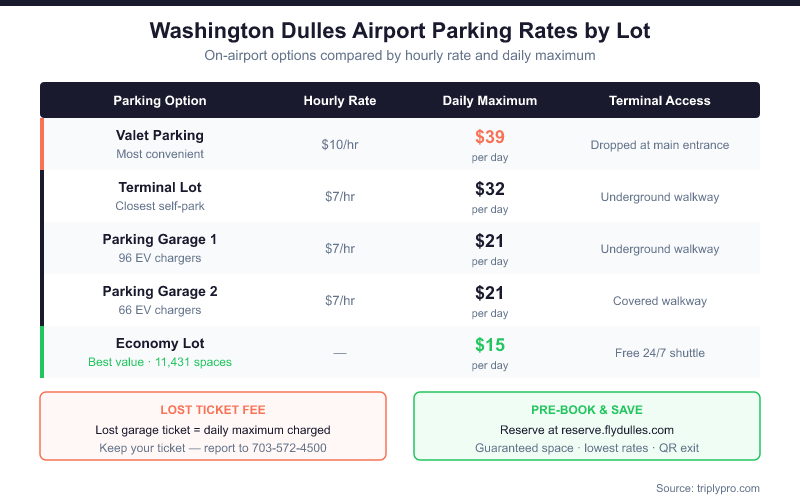 For a full breakdown of every lot, see our Dulles Airport parking rates comparison, which covers all options side by side.