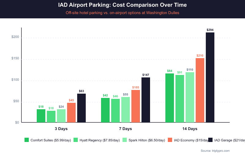 The package works best for trips of 4 days or longer. On a 7-day trip, the combined cost of one hotel night plus free parking often beats IAD's Economy Lot at $15/day — and it's far cheaper than Garage 1 or 2 at $21/day. For other IAD hotel options, see our guide to Dulles Airport hotel parking deals.