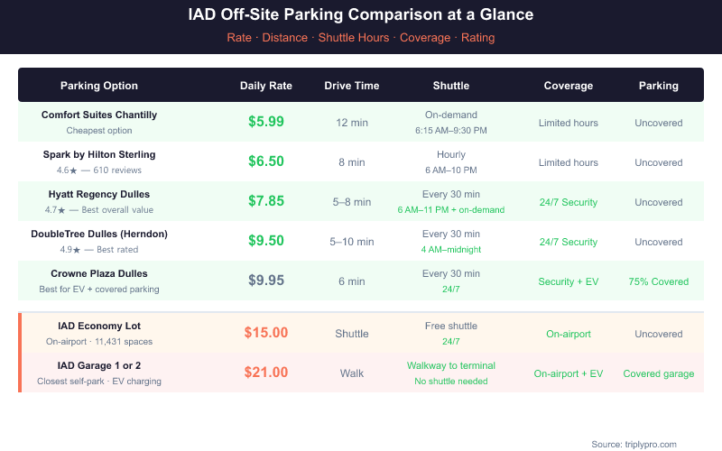 To put the Marriott Suites option in context, here are verified 2026 rates for IAD parking alternatives: