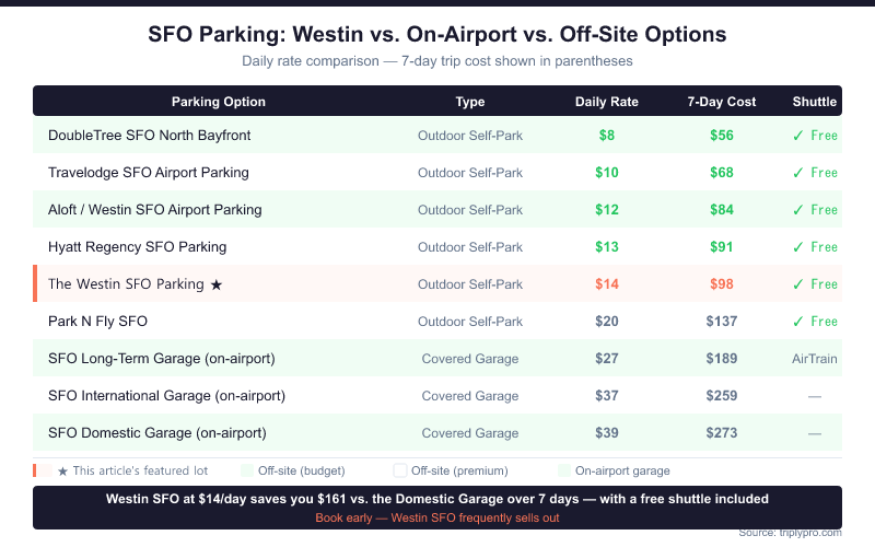 On-airport parking at SFO is convenient but expensive. Off-site hotel parking like The Westin trades a short shuttle ride for significant savings. Here's a direct comparison: