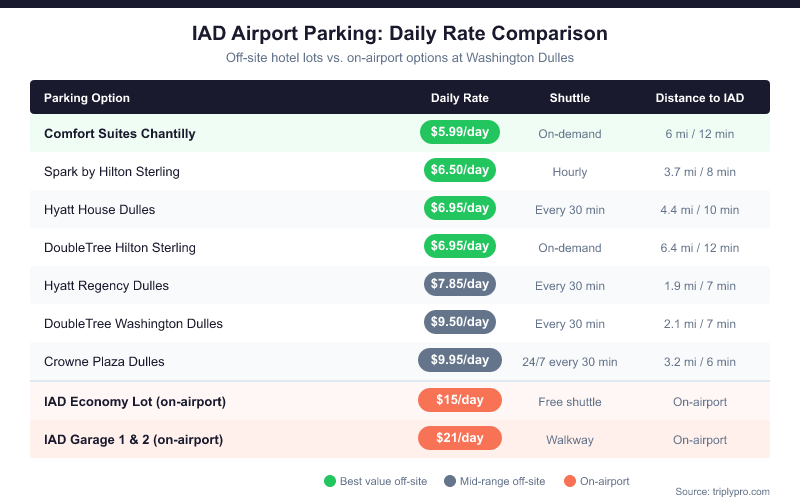 Prices and package details change, so compare current IAD park-and-fly rates before you commit. Search all IAD airport parking options on TriplyPro — compare off-site hotel lots from $5.99/day and lock in your spot before your Dulles flight.